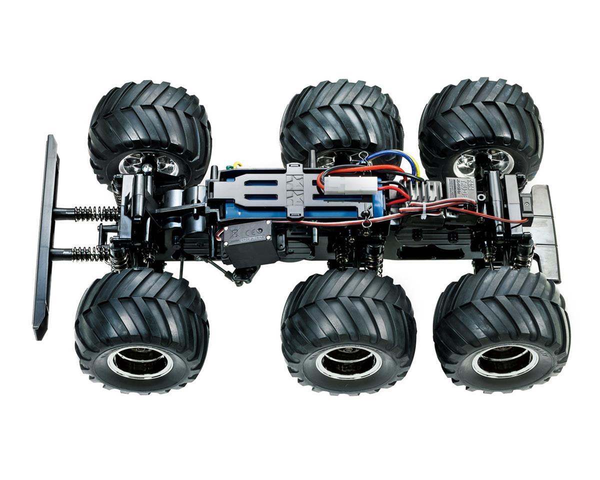 - The 6WD chassis employs 3 differential gears to transmit power from the front-center-mounted motor to all of the model's wheels