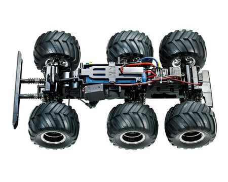 The fun G6-01 chassis is based around a tough, slimline monocoque frame and offers excellent off-road performance thanks to a 6-wheel drive system. Power is provided by a motor behind the front wheels, and transmitted to front, center and rear wheels via gears. The gearbox is sealed to protect from dust and debris, and integrated into the frame; it has built-in front, center and rear differential gears to provide smooth cornering. 6-wheel double wishbone suspension is fitted with friction dampers. A 2-piece steering tie-rod setup utilizes the servo on the left for excellent response. With suspension reassembly and a separately-sold transmitter with 4WS function and R/C equipment, the rear wheels can be made steerable.