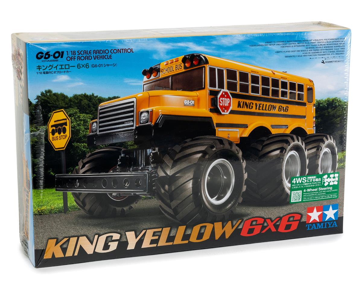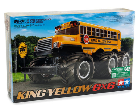 The Tamiya King Yellow 6x6 G6-01 1/18 Monster Truck Kit is the a classic! It includes a body molded in lightweight yet durable polycarbonate, and great realism thanks to the inclusion of separate parts recreating details such as roof lights and stop sign. The kit also includes stickers for decoration, and masking stickers to help with the paint job. Matte silver color plated deep rim wheels are paired with 113mm diameter tires for great off-road performance. Furthermore, its powerful gear-driven setup allows the King Yellow to take on slope inclines of up to 40 degrees!