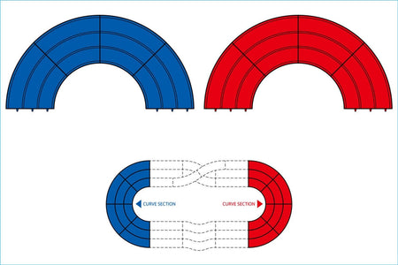 This set includes eight curve sections (4 pcs. for blue and red each), and can be used with the separately sold Lane Change & Extension Set to make the 3-lane Japan Cup Junior Circuit. Use for maintenance and extension of any course layouts you have made!