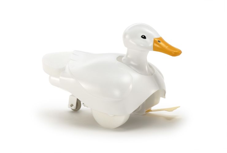 The parallel linkage mechanism recreates the bobbing head motion of a duck.