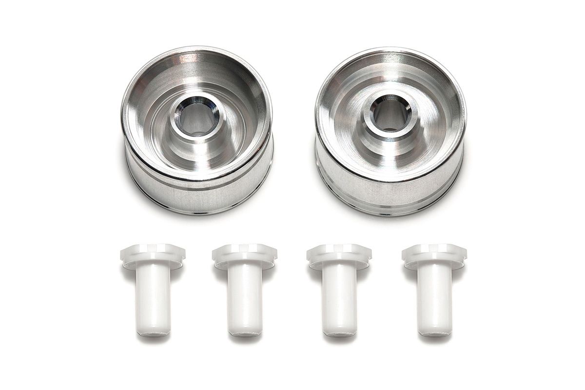 These aluminum wheels for small diameter narrow tires (24mm) are for use on Tamiya Mini 4WD race cars. The aluminum wheels add a bit of extra shine to your Mini 4WD cars. Also, their reversible design means they can be flipped over to allow installation on the Super X and XX chassis which use 72mm shafts.